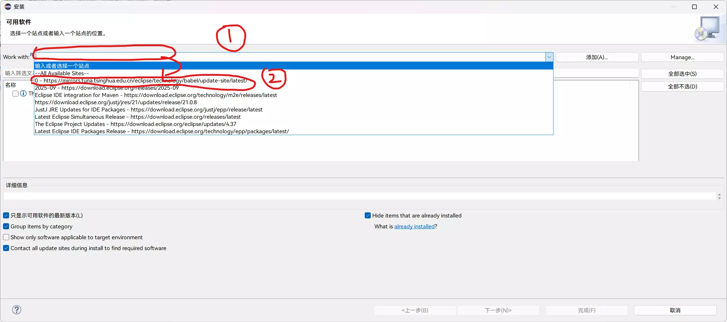 在序号1的输入框输入https://mirrors.tuna.tsinghua.edu.cn/eclipse/technology/babel/update-site/latest/